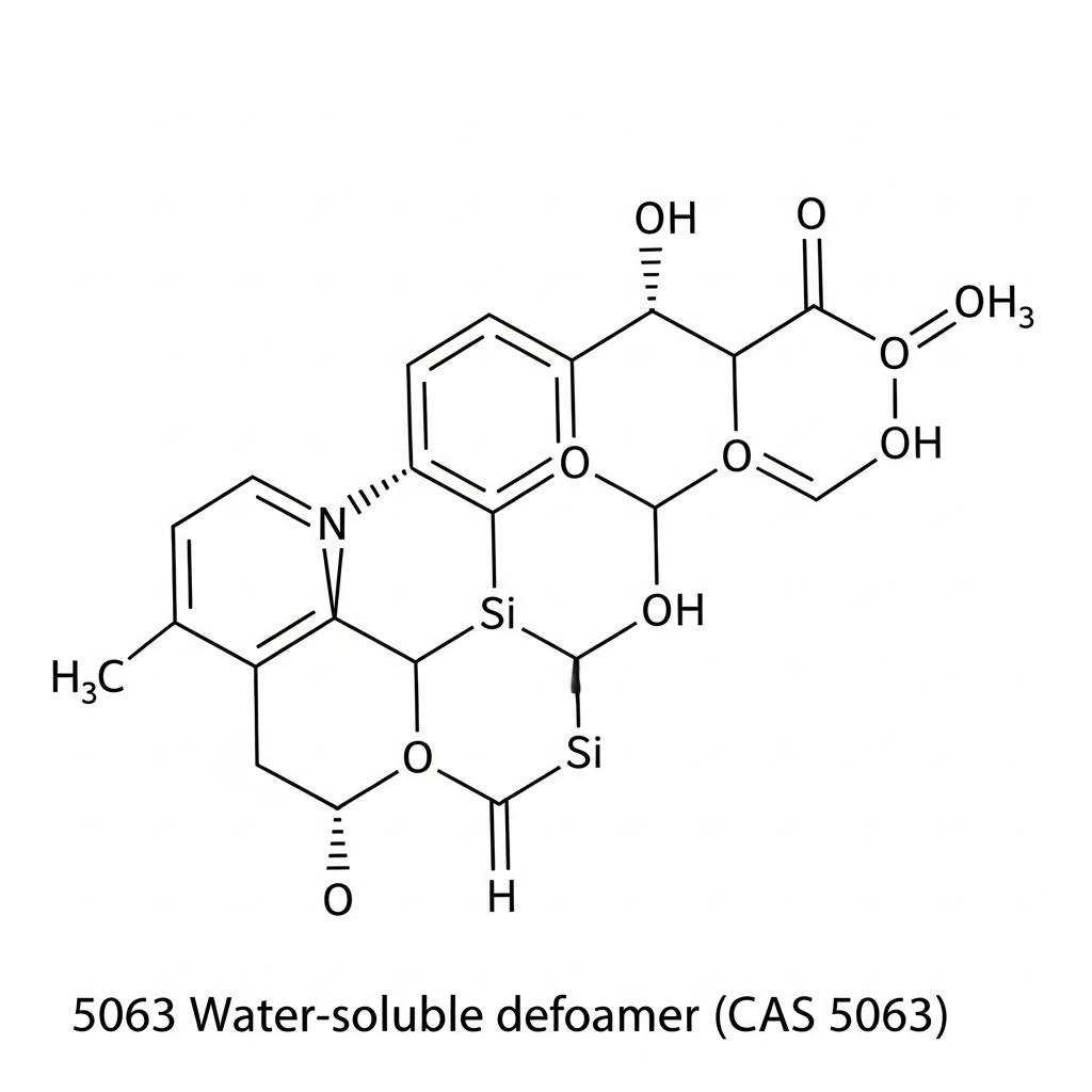 5063 is a high-performance water-soluble defoamer, primarily composed of polyether-modified polysiloxane. It is engineered for aqueous systems where foam suppression and rapid de-aeration are critical. Unlike traditional oil-based antifoams, the 5063 variant exhibits exceptional solubility and stability in water, preventing common issues like oil spotting, “fish-eyes,” or surface defects in sensitive applications like textile dyeing or high-grade coatings. Its molecular architecture allows for low surface tension, enabling it to penetrate foam lamellae efficiently. It operates effectively across a wide pH range and remains stable under high-shear conditions or elevated temperatures. It is an ideal choice for complex industrial processes such as metalworking fluids, industrial cleaning, and textile auxiliaries. By maintaining low viscosity and high dispersibility, the 5063 defoamer ensures consistent performance without compromising the integrity of the final product. It represents a versatile solution for modern chemical processing requiring both high efficiency and ease of incorporation within various aqueous matrices.
