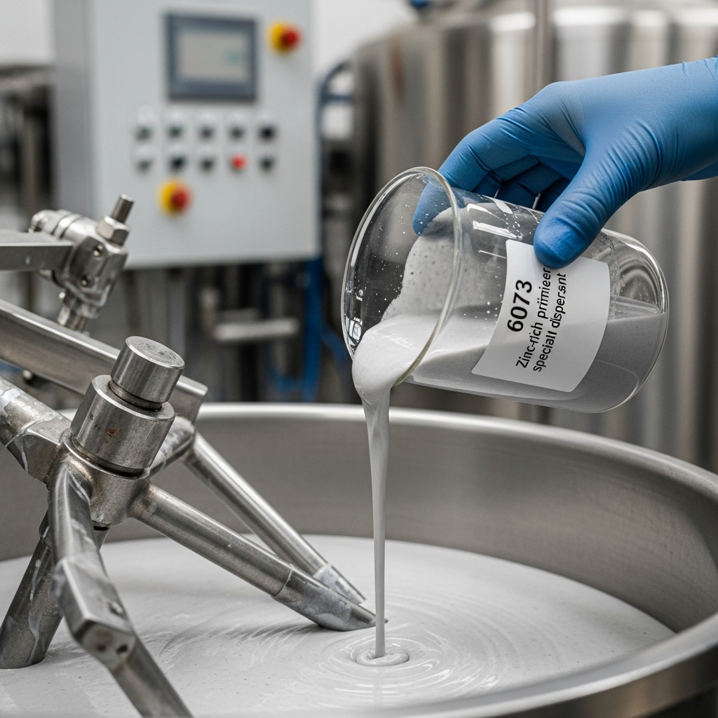 The 6073 Zinc-Rich Primer Special Dispersant is a high-performance, non-ionic additive specifically engineered to address the complex stabilization challenges inherent in high-solids metallic coatings. Formulated as a high molecular weight block copolymer, it provides exceptional wetting and steric stabilization for inorganic fillers and metallic zinc powders. In zinc-rich environments, pigment particles tend to undergo severe agglomeration and hard-settling due to their high density and reactive surface nature. The 6073 additive mitigates these issues by forming a robust adsorbed layer on the particle surface, significantly reducing viscosity while enhancing the flow and leveling properties of the final coating. This dispersant is particularly effective in preventing the “cementing” effect common in epoxy zinc-rich primers, ensuring long-term shelf stability and consistent sprayability. By optimizing the packing density of zinc particles, it further contributes to the cathodic protection efficiency and corrosion resistance of the protective film, making it indispensable for heavy-duty industrial anti-corrosion applications.