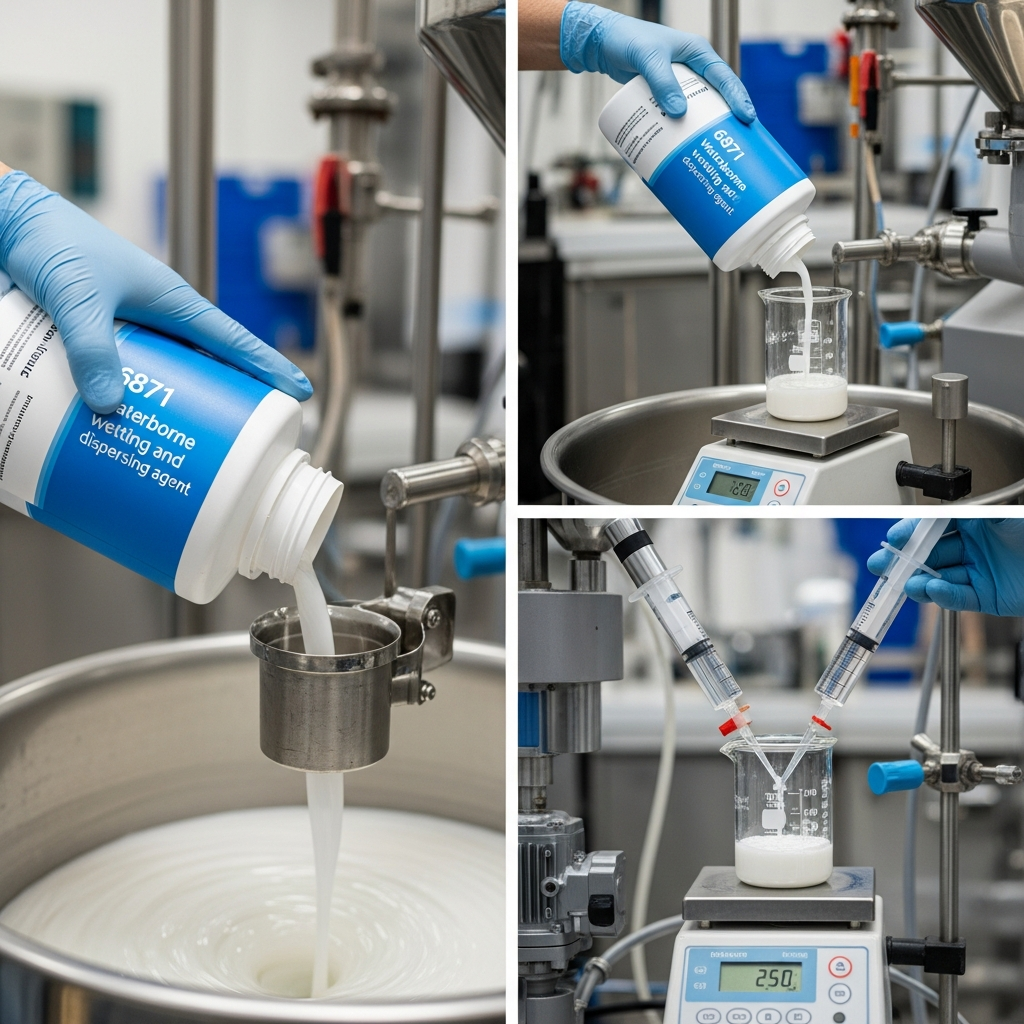 The 6871 Waterborne Wetting and Dispersing Agent represents a premium additive engineered for high-performance aqueous coatings and ink systems. Formulated as a high molecular weight block copolymer with pigment-affinic groups, this specialized chemical provides exceptional stabilization for both organic and inorganic pigments, as well as carbon black. By facilitating the wetting process and providing robust steric hindrance, 6871 effectively prevents the flocculation and re-agglomeration of pigment particles during the grinding stage and long-term storage. Its non-ionic nature ensures excellent compatibility across a broad pH range and various resin types, including acrylic, epoxy, and polyurethane dispersions. Notably, this additive is designed to significantly reduce mill-base viscosity, allowing for higher pigment loading and improved manufacturing efficiency. The resulting dispersions exhibit superior color strength, high gloss levels, and minimal rub-out effects. Environmentally compliant and VOC-free, 6871 is an indispensable component for formulating modern, sustainable, and high-quality industrial waterborne coatings and colorants.