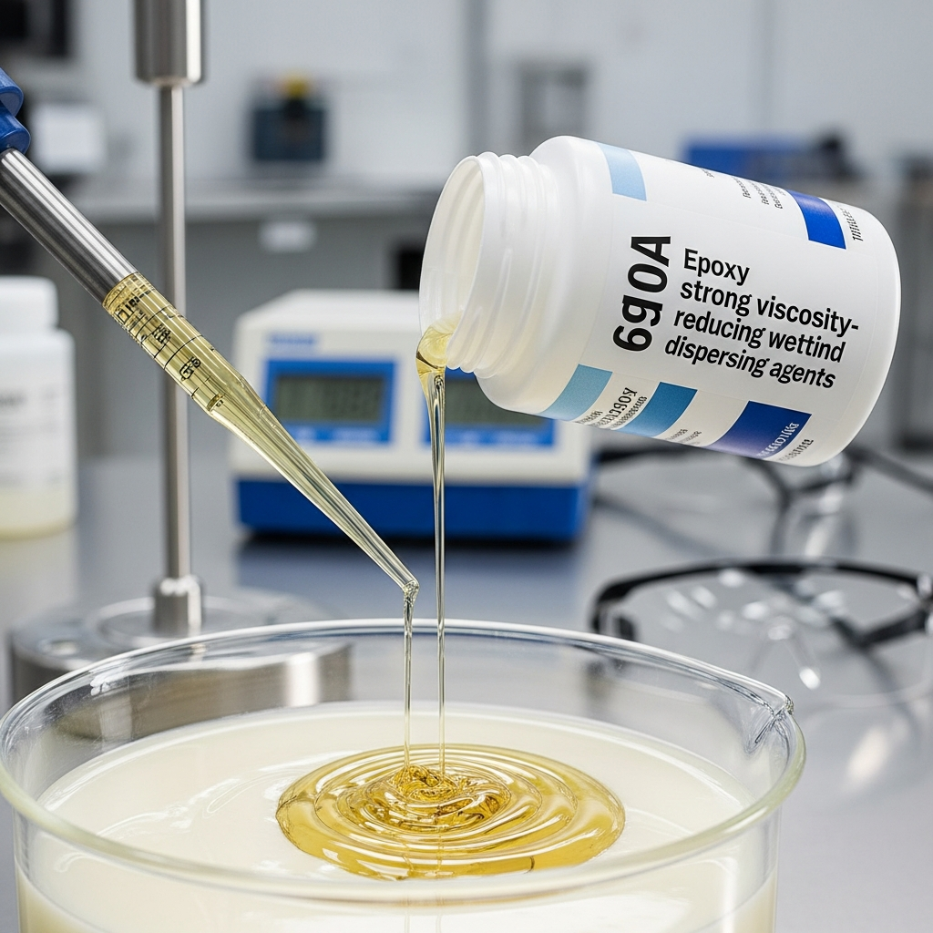 6910A is a premium, solvent-free wetting and dispersing additive specifically engineered for high-performance epoxy resin systems. As a high-molecular-weight copolymer featuring multiple pigment-affinic groups, it excels in stabilizing inorganic pigments and fillers such as titanium dioxide, calcium carbonate, and quartz flour. The primary mechanism involves the steric stabilization of dispersed particles, which effectively prevents re-agglomeration and flocculation. By significantly lowering the interfacial tension between the resin matrix and solid particles, 6910A facilitates rapid wetting during the grinding process. This results in a dramatic reduction in mill-base viscosity, allowing formulators to achieve exceptionally high pigment loadings without compromising flow properties. Beyond rheological optimization, 6910A enhances the aesthetic and protective qualities of the final coating by improving gloss retention, preventing flooding or floating, and ensuring uniform color development. It is an indispensable component for developing VOC-compliant, high-solids epoxy coatings that require superior durability and resistance in demanding industrial environments. It maximizes performance.