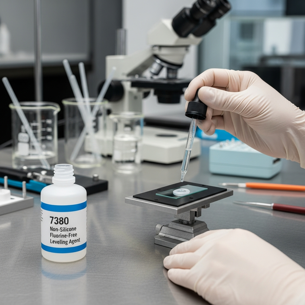 7380 is a high-performance, non-silicone, and fluorine-free levelling agent specifically engineered for advanced coating systems requiring superior surface aesthetics without the traditional risks associated with silicone contamination. Developed as a sustainable alternative to fluorinated additives, this specialized polyacrylate-based polymer facilitates exceptional substrate wetting and promotes a flawlessly smooth film surface. Its primary mechanism involves the strategic reduction of surface tension differentials, effectively eliminating common film defects such as orange peel, craters, and pinholes. Unlike conventional silicone additives, 7380 does not impair intercoat adhesion or cause recoatability issues, making it an ideal selection for multi-layer automotive coatings, industrial finishes, and high-gloss wood stains. By maintaining a stable surface energy profile, it ensures consistent application across diverse substrates, including low-energy plastics and metals. As global regulations increasingly restrict the use of per- and polyfluoroalkyl substances (PFAS), 7380 offers a compliant, eco-friendly solution for manufacturers prioritizing environmental safety without compromising mechanical performance standards.
