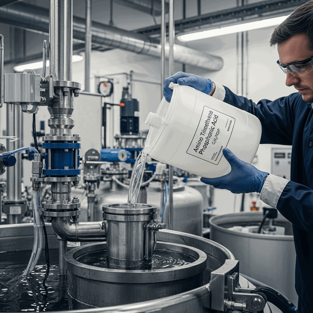 Amino Trimethylene Phosphonic Acid (ATMP), identified by CAS number 6419-19-8, is a highly effective organophosphonic acid widely recognized for its superior sequestration and scale inhibition properties. Structurally, it consists of a central nitrogen atom bonded to three phosphonic acid functional groups via methylene bridges (N(CH2PO3H2)3). This configuration allows ATMP to function as a powerful multi-dentate chelating agent.