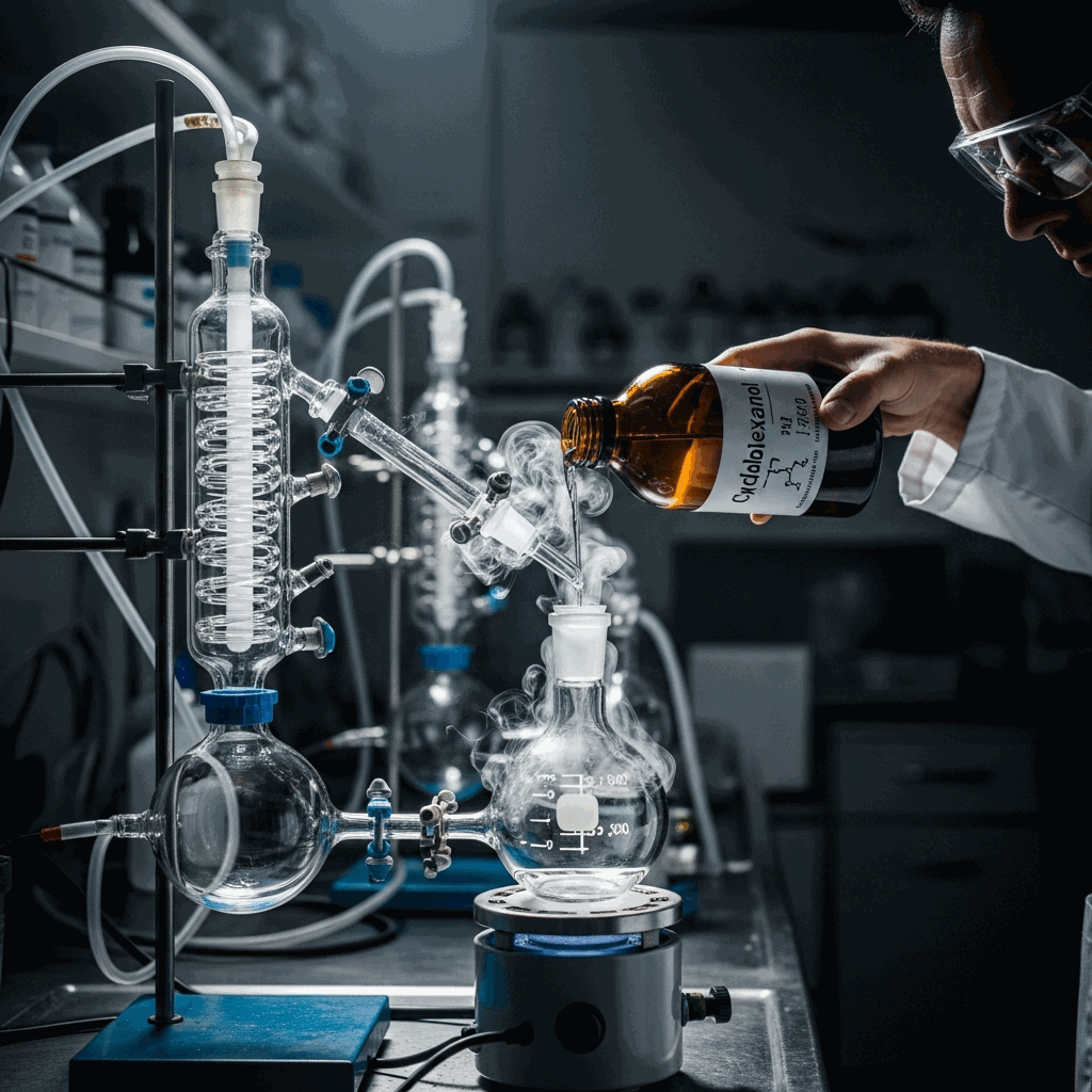 Cyclohexanol, identified by CAS number 108-93-0, is a secondary alcohol derived from cyclohexane through oxidation. It appears as a colorless, viscous liquid or a needle-like solid at temperatures below its melting point of approximately 25 degrees Celsius. This cyclic organic compound possesses a distinctive, camphor-like odor and is slightly soluble in water while being highly miscible with most common organic solvents, including ethanol, ether, and benzene. Primarily, cyclohexanol serves as a critical intermediate in the industrial production of adipic acid and caprolactam, which are the fundamental precursors for manufacturing Nylon 6,6 and Nylon 6, respectively. Beyond its role in polymer synthesis, it functions effectively as a versatile solvent for resins, lacquers, and various coatings. Its chemical reactivity allows it to undergo dehydration to form cyclohexene or oxidation to produce cyclohexanone. Due to its stability and utility, cyclohexanol remains an essential building block in the global chemical industry, supporting diverse manufacturing.