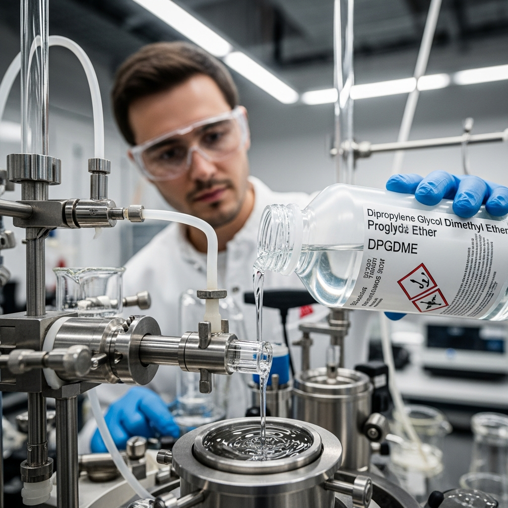 Dipropylene Glycol Dimethyl Ether (DPGDME), commercially known under trade names such as Proglyde™ DMM, is a versatile, colorless, and low-toxicity organic solvent characterized by its aprotic nature. Unlike standard glycol ethers, DPGDME is a “capped” glycol ether, meaning both terminal hydroxyl groups are replaced by methoxy groups. This lack of reactive hydroxyl functionality makes it chemically inert and exceptionally stable in highly alkaline or acidic environments where traditional alcohols would degrade or react.