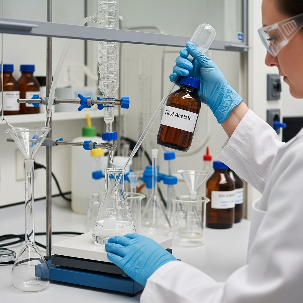 Ethyl acetate (CAS: 141-78-6), also known as ethyl ethanoate, is a significant organic ester widely utilized for its versatile solvent properties and characteristic fruity aroma. Chemically represented by the formula $CH_3COOCH_2CH_3$, it is synthesized via the Fischer esterification of ethanol and acetic acid, typically in the presence of an acid catalyst. As a polar aprotic solvent, it provides an optimal balance between high solvency power and low toxicity, often serving as a safer alternative to aromatic or chlorinated hydrocarbons. Its relatively low boiling point and high volatility facilitate rapid evaporation, which is a critical requirement in industrial coating and printing processes. Beyond synthetic applications, ethyl acetate occurs naturally in various fruits and fermentation byproducts. It is valued in laboratory settings for liquid-liquid extraction and chromatography. While classified as a highly flammable liquid, its high biodegradability and low bioaccumulation potential make it an environmentally preferred choice in modern chemical manufacturing.