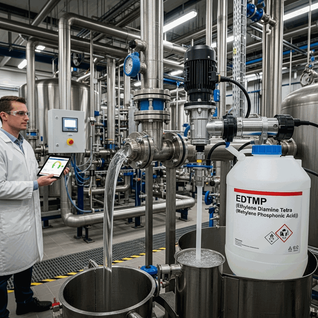 Ethylene Diamine Tetra (Methylene Phosphonic Acid), commonly known as EDTMP or EDTMPA (CAS: 1429-50-1), is a high-performance nitrogenous organic polyphosphonic acid. It is a member of the organic phosphonate family and serves as a functional analogue to EDTA, where the carboxylic acid groups are replaced by phosphonic acid groups. This structural shift provides EDTMP with superior sequestration capabilities and significantly higher thermal stability. In aqueous solutions, EDTMP dissociates into multiple anions, allowing it to chelate with various polyvalent metal ions—such as calcium, magnesium, iron, and copper—to form stable, water-soluble coordination complexes. It is particularly valued for its “threshold effect,” where sub-stoichiometric concentrations effectively inhibit scale precipitation. Due to its robust chemical stability under high-temperature and high-pH conditions, EDTMP is a critical additive in industrial water treatment, textile processing, and oilfield operations, where it functions as both a powerful sequestrant and a corrosion inhibitor.