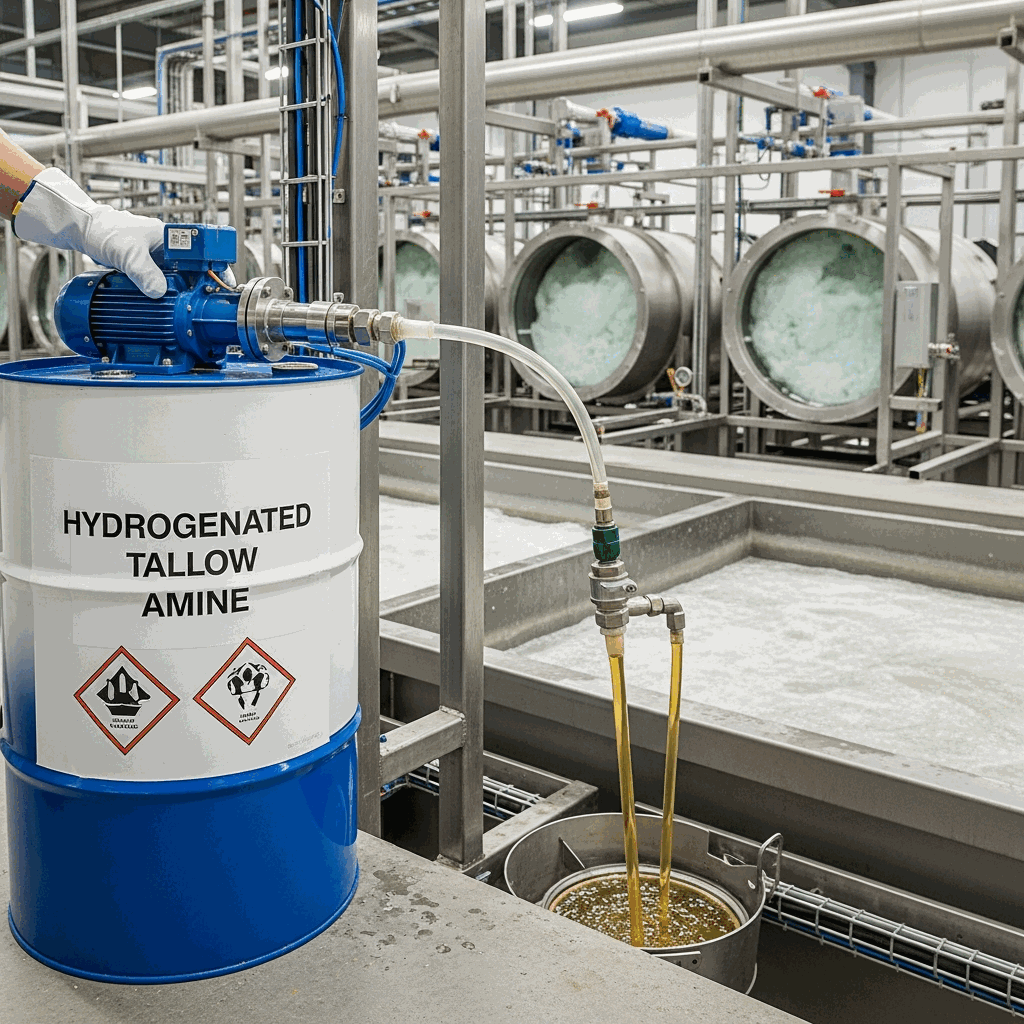 Hydrogenated Tallow Amine (CAS: 61788-45-2) is a high-purity primary aliphatic amine derived from the fatty acids of tallow. The production process involves the catalytic hydrogenation of tallow-derived nitriles, which ensures the saturation of the alkyl chains. This saturation distinguishes it from standard tallow amine by providing significantly enhanced thermal and oxidative stability. Chemically, it consists primarily of a mixture of saturated C16 (palmitic) and C18 (stearic) hydrocarbon chains attached to a polar primary amino group.