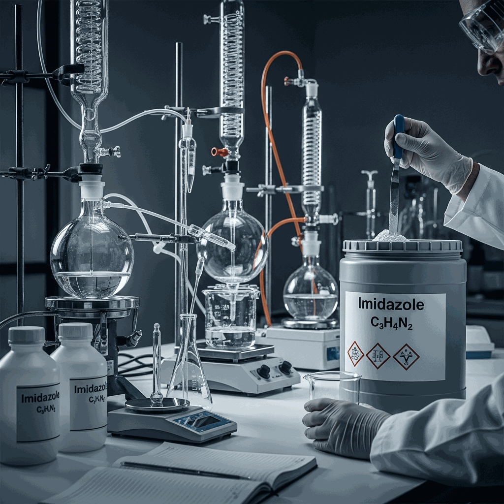 Imidazole, identified by CAS number 288-32-4, represents a fundamental five-membered heterocyclic aromatic organic compound characterized by the presence of two nitrogen atoms at positions one and three. This white to pale yellow crystalline solid is highly soluble in water and polar organic solvents, exhibiting significant amphoteric properties due to its ability to act as both a Brønsted acid and a base. Its electronic structure provides exceptional thermal stability and resonance stabilization, making it a critical structural motif in biological systems, most notably within the amino acid histidine and the neurotransmitter histamine. In industrial chemistry, imidazole serves as a versatile building block for synthesizing diverse pharmaceuticals, agrochemicals, and specialty polymers. Its unique chemical reactivity allows it to participate in complex coordination chemistry, acting as an effective ligand for transition metals. Furthermore, its role as a corrosion inhibitor and curing agent in epoxy resins highlights its broad utility across multiple technological sectors.