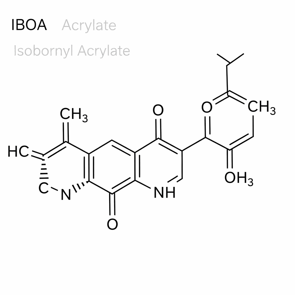Isobornyl Acrylate, commonly abbreviated as IBOA, is a monofunctional monomer characterized by its unique bridged bicyclic structure derived from natural camphor. This high-purity clear liquid belongs to the acrylate ester family and is widely utilized in radiation-curing technologies. Its chemical structure features a bulky isobornyl group which provides exceptional rigidity and a high glass transition temperature to the resulting polymers. Despite its high molecular weight relative to other acrylic monomers, IBOA maintains a remarkably low viscosity, making it an efficient reactive diluent in UV and electron beam curable formulations. The monomer exhibits low volatility and a high boiling point, enhancing safety during industrial processing. Chemically, it undergoes rapid free-radical polymerization when exposed to ultraviolet light in the presence of photoinitiators. This versatility stems from its ability to balance hardness and flexibility while offering excellent weatherability, water resistance, and chemical stability, positioning IBOA as a critical component in advanced material science.