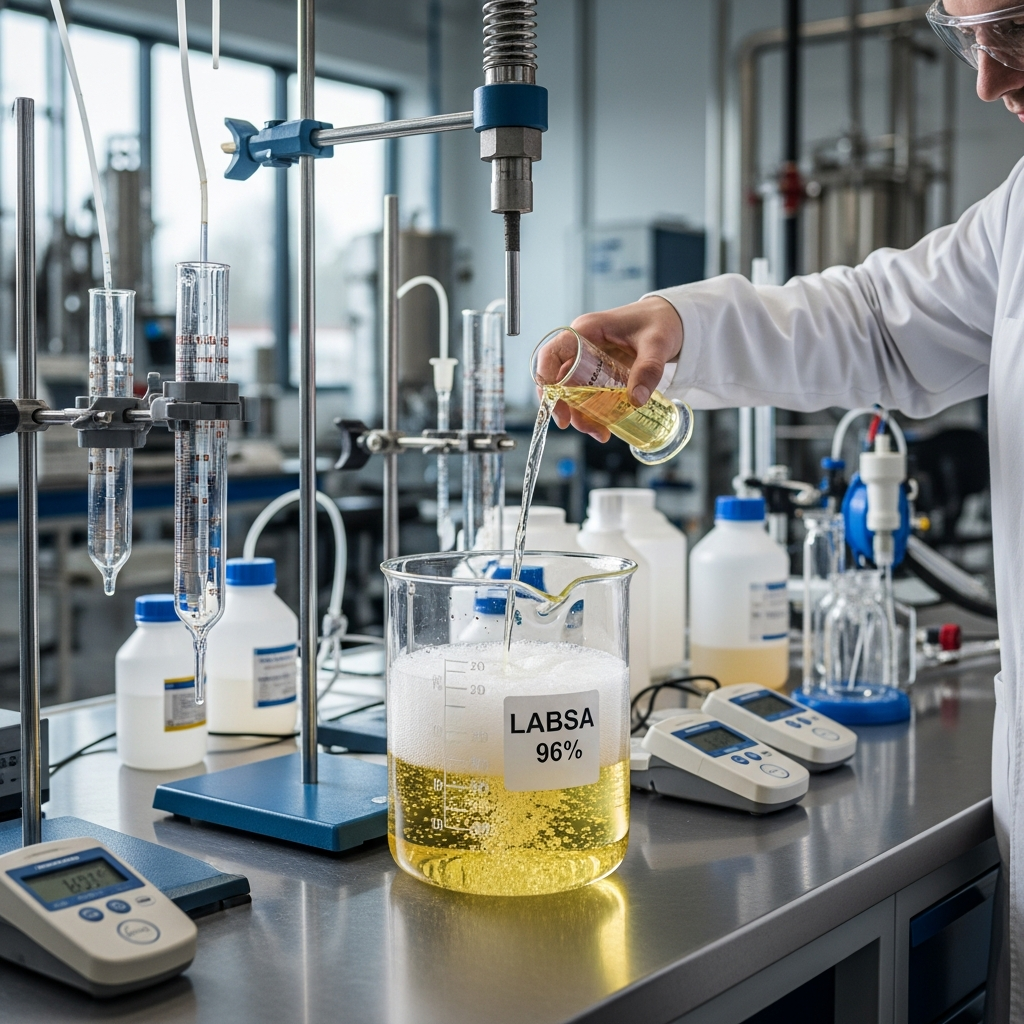 LABSA is prized primarily for its versatility; it serves as a fundamental building block for the production of various cleaning agents. While it is highly acidic in its concentrated form, it is typically neutralized with caustic soda (Sodium Hydroxide) to produce Sodium Linear Alkyl Benzene Sulfonate (LAS). Its transition from branched alkylbenzene sulfonates (BAS) to linear structures (LABSA) in the mid-20th century marked a significant environmental milestone, as the linear chain ensures rapid aerobic biodegradation, preventing persistent foam in wastewater treatment systems.