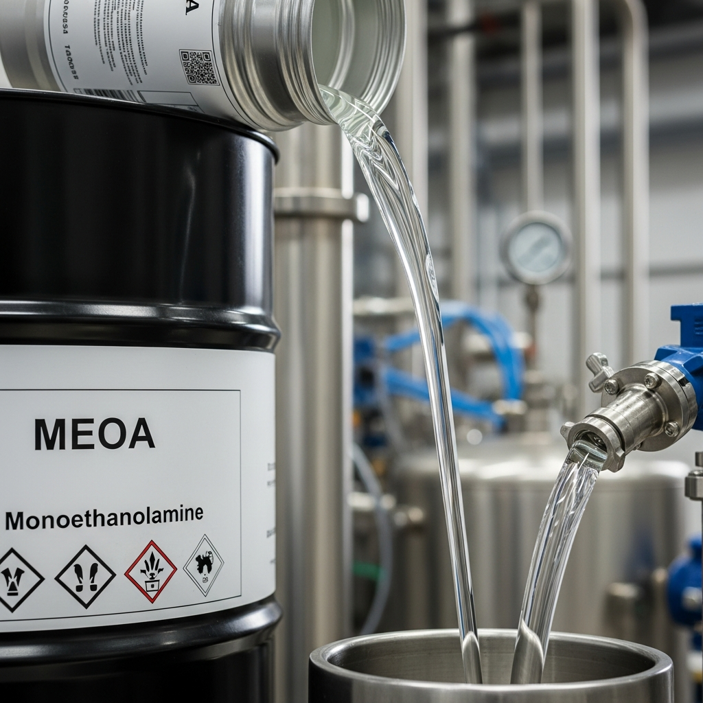 MEOA is highly hygroscopic and completely miscible with water, Alcohol, and acetone. It plays a pivotal role in environmental engineering as a primary agent for “gas sweetening,” effectively removing acidic components like carbon dioxide ($CO_2$) and hydrogen sulfide ($H_2S$) from natural gas and refinery process streams. Due to its alkaline nature and surfactant-precursor capabilities, it is indispensable in the formulation of detergents, personal care products, and agricultural chemicals. Proper handling is essential, as it is classified as a corrosive substance.