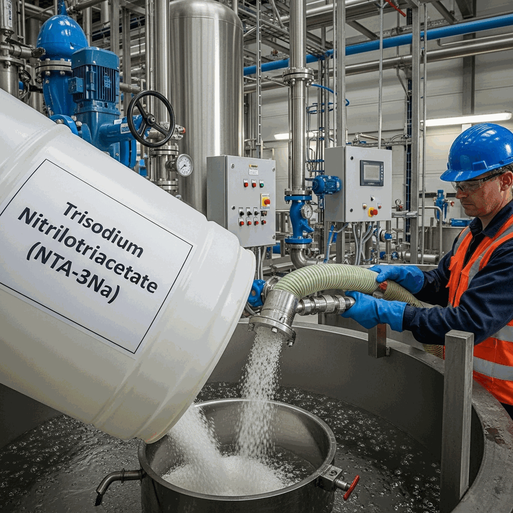 Trisodium Nitrilotriacetate (NTA-3Na) is a highly efficient chelating agent belonging to the aminopolycarboxylic acid family. It is chemically defined as the trisodium salt of nitrilotriacetic acid and is valued for its ability to form stable, water-soluble complexes with polyvalent metal ions, including calcium, magnesium, iron, and copper. By sequestering these ions, NTA-3Na prevents the precipitation of insoluble salts and inhibits unwanted catalytic reactions in chemical processes.