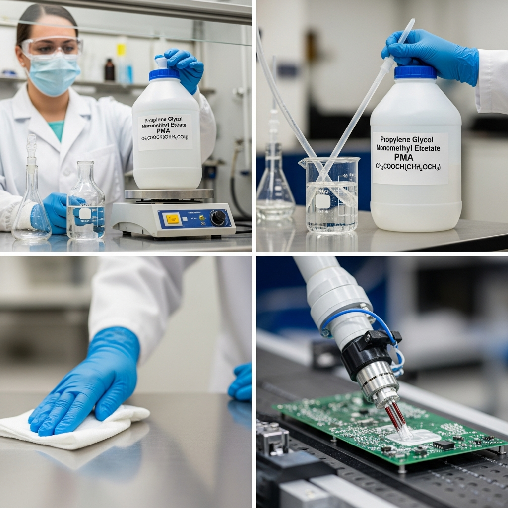 PMA is synthesized through the esterification of propylene glycol monomethyl ether with acetic acid. Its unique molecular structure, featuring both ether and ester functional groups, provides it with exceptional solvency power for a wide range of synthetic resins, including acrylics, epoxies, alkyds, and polyesters. In the high-tech sector, PMA is the “gold standard” solvent for the microelectronics industry, specifically used in photolithography. Its high purity and ability to dissolve photoresists make it indispensable for semiconductor fabrication. Its balanced evaporation rate ensures superior film formation and surface leveling in high-end coating applications.