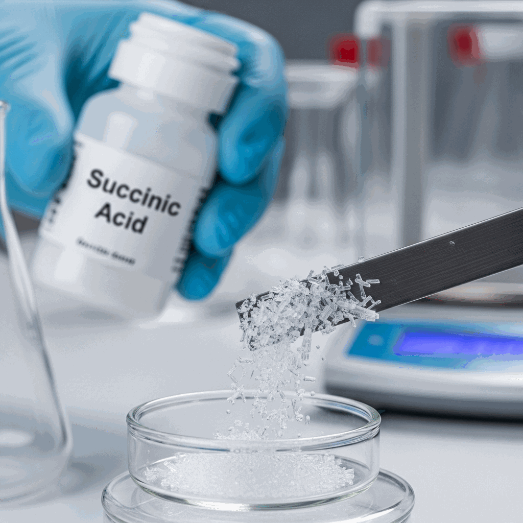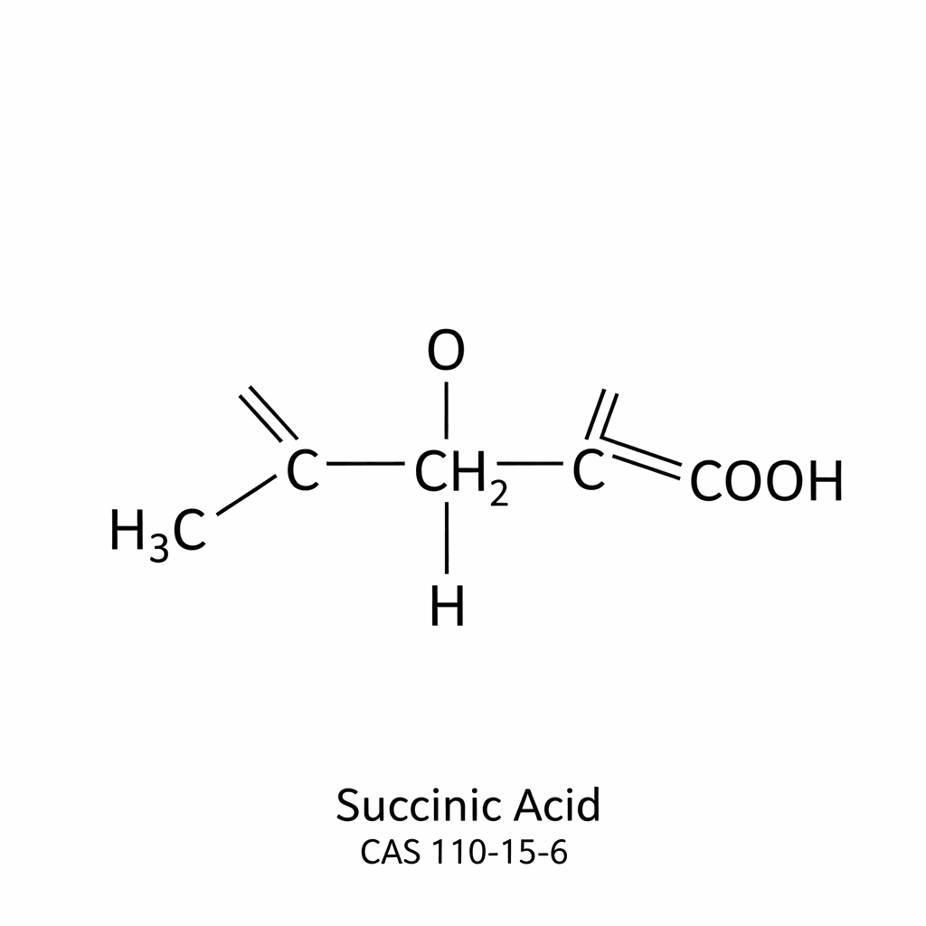 Succinic acid, systematically known as butanedioic acid, is a dicarboxylic acid with the chemical formula (CH2)2(CO2H)2. This naturally occurring organic compound is a white, odorless solid at room temperature and is widely distributed in nature, appearing in various plant and animal tissues. It serves as a vital intermediate in the citric acid cycle, facilitating cellular respiration and energy metabolism. Produced industrially via the hydrogenation of maleic acid or through specialized fermentation of glucose and biomass sources, succinic acid is gaining prominence as a key bio-based platform chemical. Its unique structure, featuring two carboxylic acid groups, allows it to participate in numerous chemical reactions, including esterification, dehydration, and amidation. Its high reactivity makes it an essential precursor for synthesized polymers, resins, and surfactants. Known for its biodegradability and low toxicity, succinic acid is increasingly favored in sustainable chemistry, serving as a versatile building block for diverse industrial, pharmaceutical, and food-grade applications.