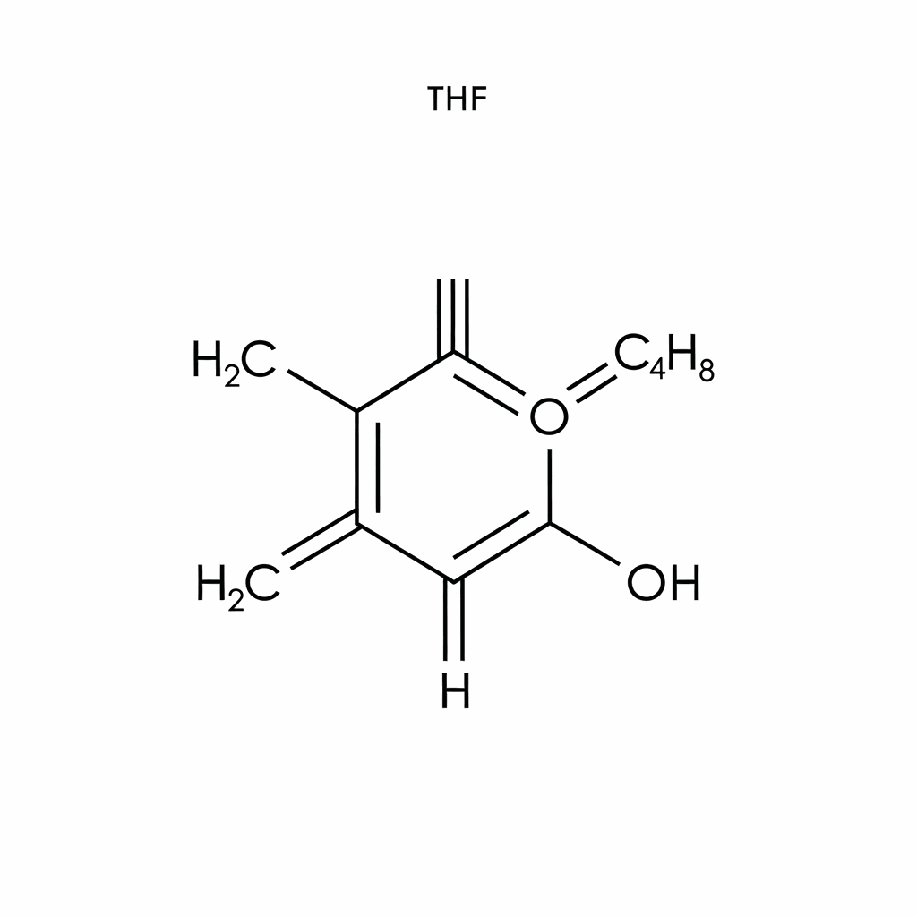 Tetrahydrofuran, or THF, is a heterocyclic organic compound with the molecular formula (CH2)4O, classified as a cyclic ether. It is a colorless, water-miscible liquid with a low viscosity and a characteristic ethereal odor reminiscent of diethyl ether. As a polar aprotic solvent, THF is highly valued in chemical synthesis due to its wide liquid range and ability to dissolve a diverse array of polar and non-polar substances. It is primarily produced via the acid-catalyzed dehydration of 1,4-butanediol or the hydrogenation of furan. THF is notoriously prone to forming explosive peroxides upon exposure to air and light, necessitating the addition of stabilizers like BHT for safe storage. Its medium dielectric constant and coordination capabilities make it a preferred medium for Grignard reactions and organometallic syntheses. Despite its utility, THF is highly flammable and requires stringent handling protocols to mitigate fire risks and potential health hazards associated with inhalation or skin exposure.